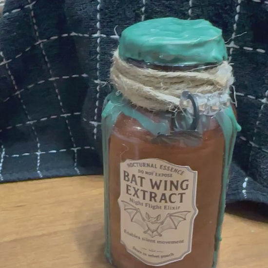 Dark and mysterious, this 5" potion bottle holds swirling waves of rich brown and shimmering enchantment. Sealed with oozing hot wax and bound in rustic twine, it’s guarded by a bat-charmed talisman to keep its secrets safe. The eerie label reads “Nocturnal Essence” and warns: “Do NOT Expose – Night Flight Elixir.” A hauntingly perfect piece to add to your Halloween décor or potion collection.
